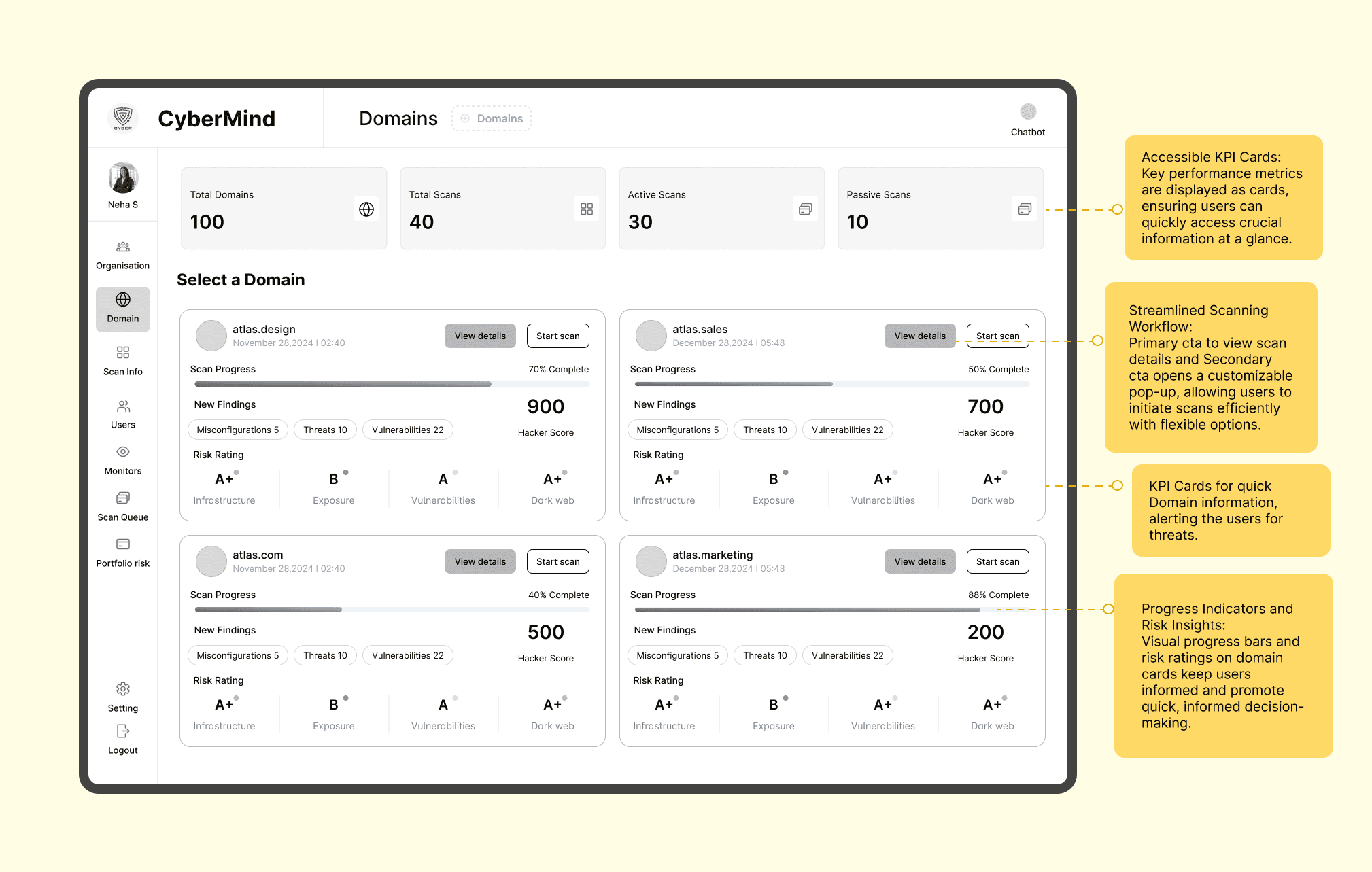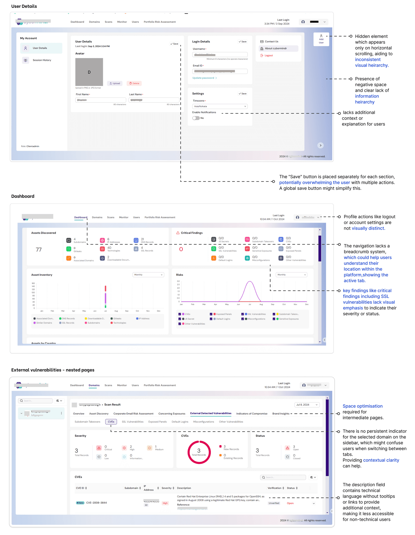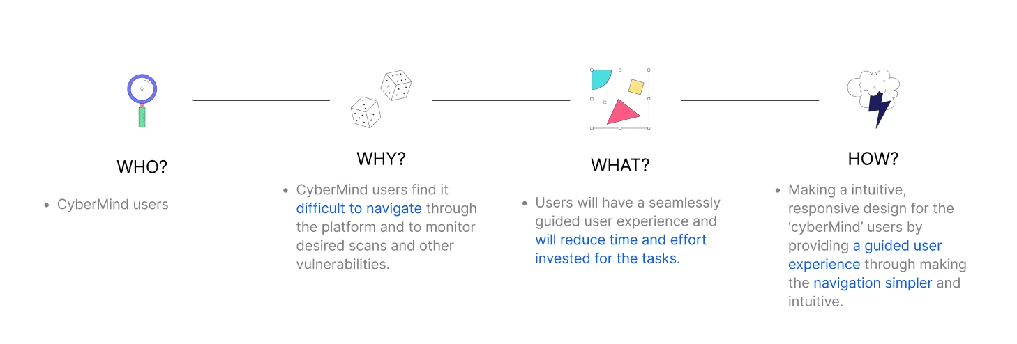 “Users of the Cybermind platform face challenges in completing key tasks, such as monitoring scans and vulnerabilities, due to complex navigation. Simplifying and streamlining the platform's navigation with a more intuitive, user-guided experience will enhance usability and provide a seamless experience for users.”