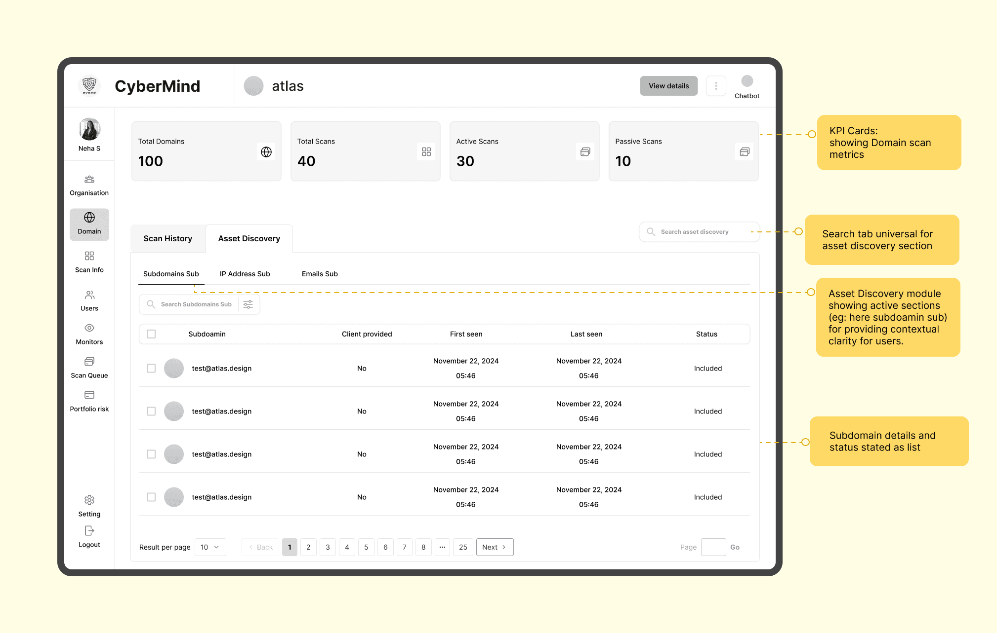 Contextual Clarity: Asset discovery highlights active sections, with subdomain details listed for better user understanding.