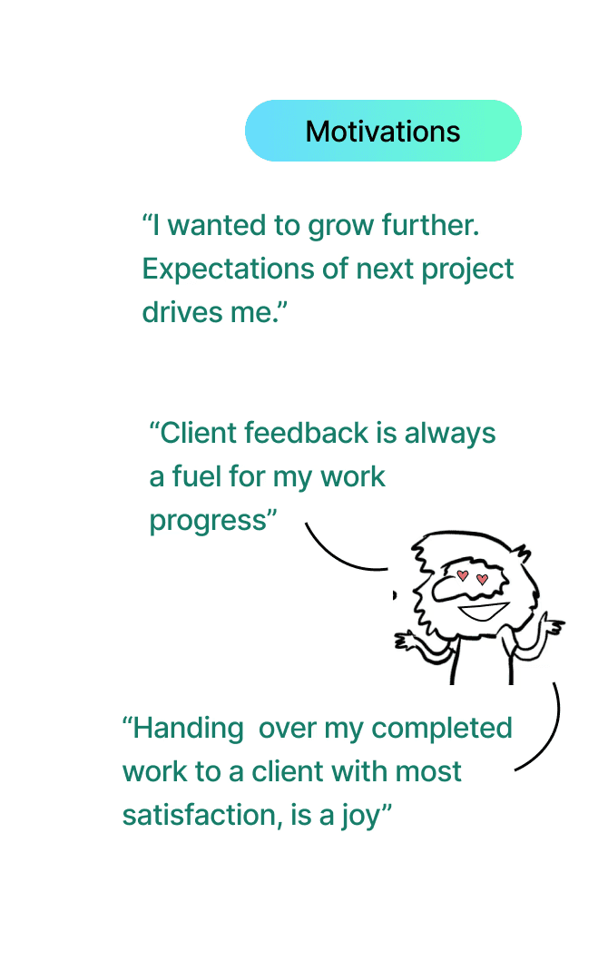 Interview insights suggest that freelancers like the their working style since they can be their own boss and are in control of their work. They appreciate the flexibility that comes with their job since it gives them the freedom to structure their routine. Freelancers like the creative freedom since they can create and work in their own style.